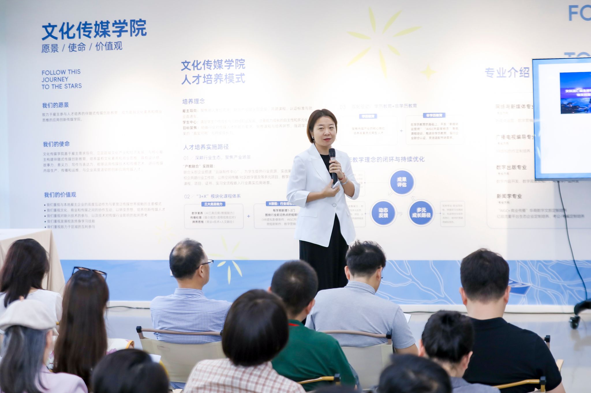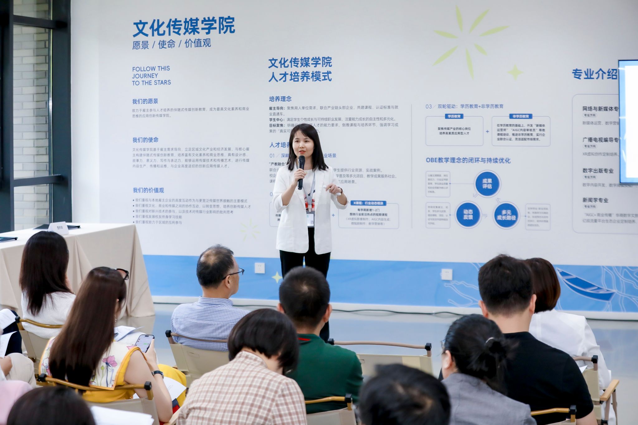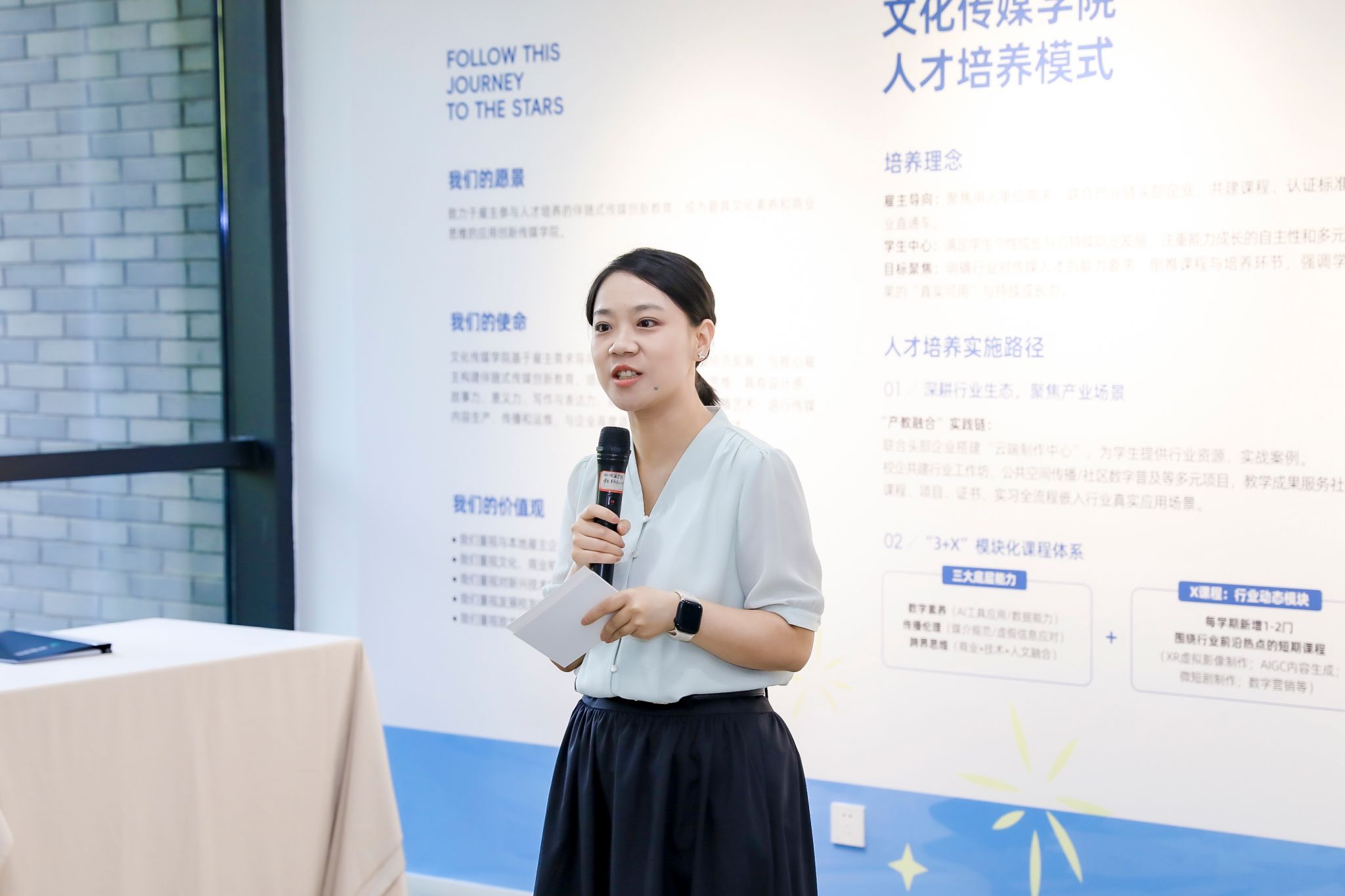 文化传媒学院院长助理彭欣在发布会上分享了《ESC传媒教育创新模式路径探索》,展示分院在课程设计与实践结合的创新成果。