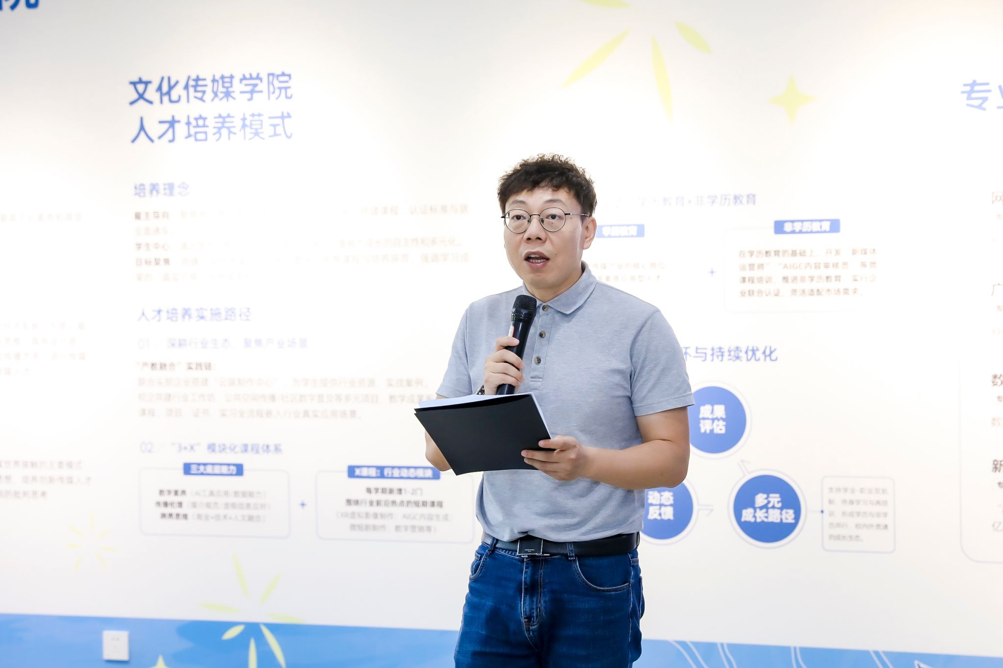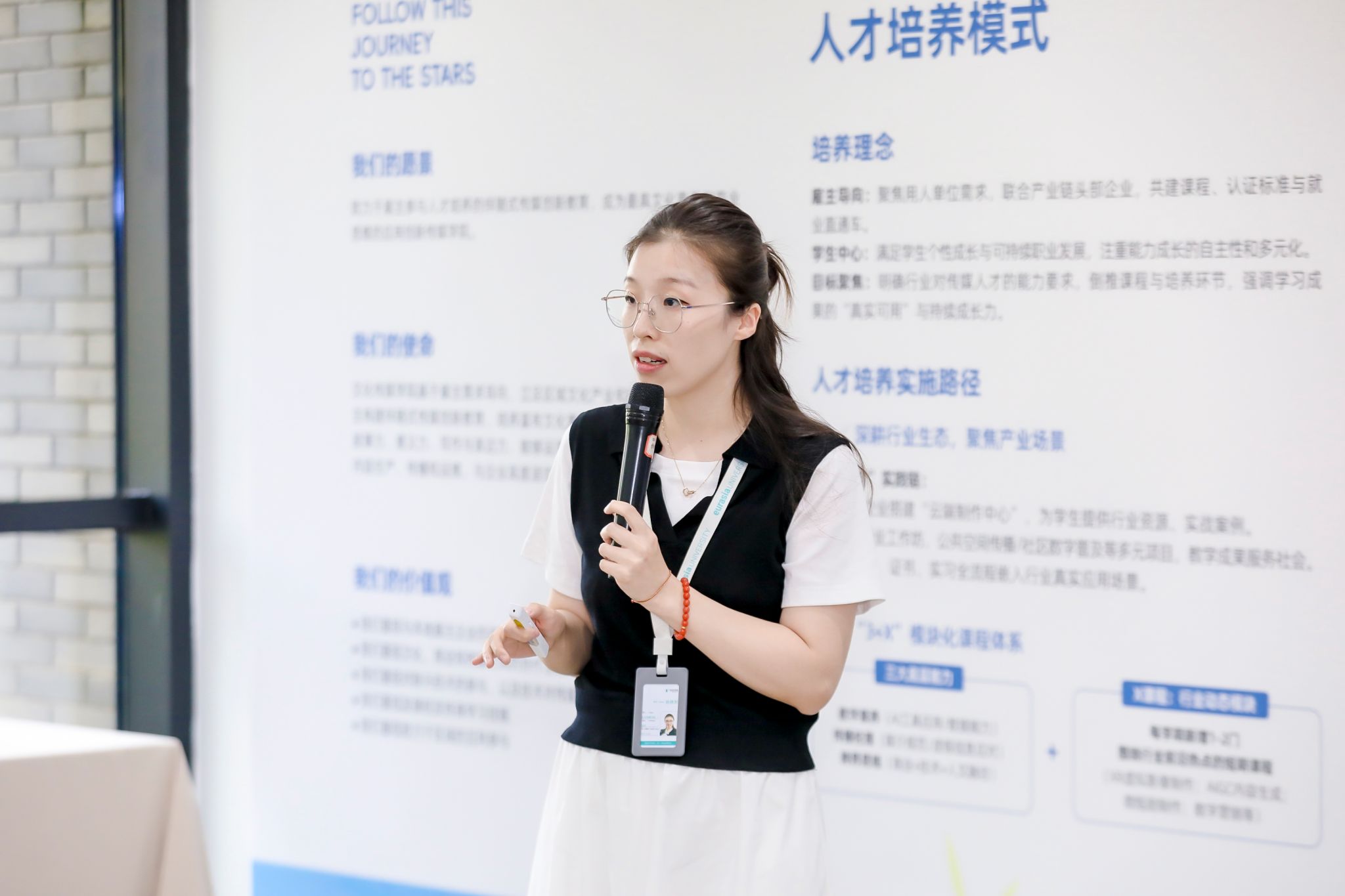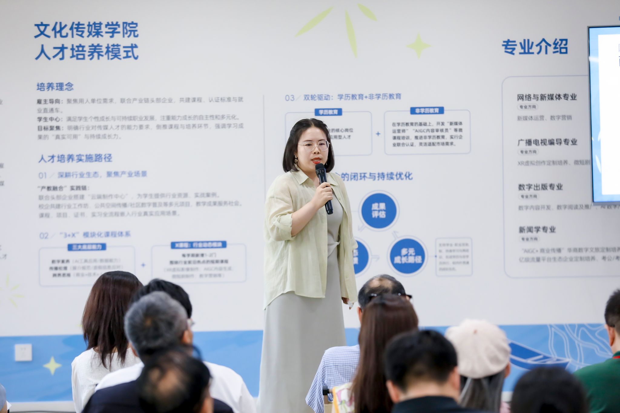 文化传媒学院院长助理彭欣在发布会上分享了《ESC传媒教育创新模式路径探索》,展示分院在课程设计与实践结合的创新成果。