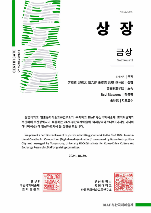 2024年罗颖颖、郑棋文、汪文婷、朱彦霓、张林姣、刘琪创作作品《布依花様》获得釜山国际艺术节(Busan International Art Festival,简称BIAF),国际金奖。