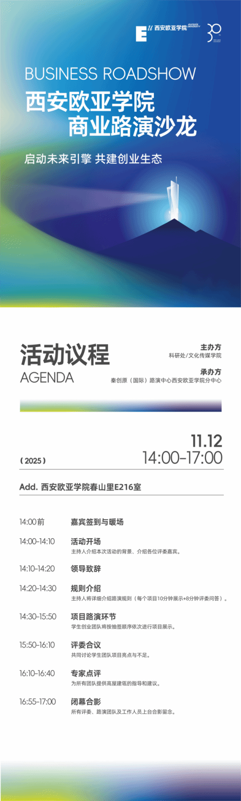 这不仅是一场项目路演,更是西安欧亚学院创新创业教育成果的集中展示,是“高校培育-平台赋能”模式的生动实践。诚邀您莅临现场,与专家评委一起,共同见证创新火花的绽放,感受校园最前沿的创业脉搏!