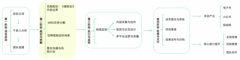 课程通过“欧亚校园植物志”这一真实项目,系统训练学生的目标拆解、资源协调、风险控制、进度管理、团队协作等核心能力。学生不仅在技术上学会使用甘特图、WBS、干系人分析等工具,更在思维上建立起系统性、流程化、结果导向的项目认知。