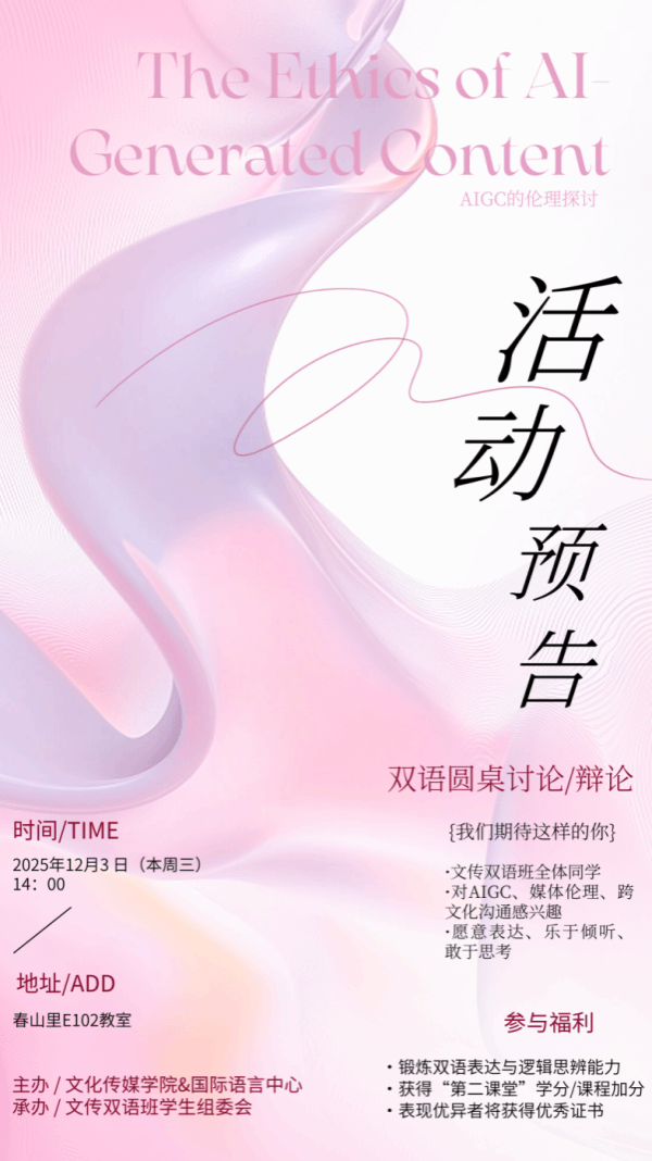 你是否关注过AI生成内容背后的伦理问题?你是否想要在轻松开放的氛围中锻炼双语表达与思辨能力?文传双语班“融汇·传新”系列活动之——“媒介万花筒”学生双语沙龙,等你来发声!