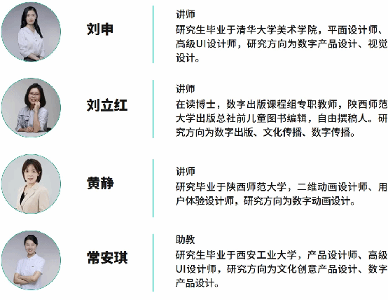 技术应用课+兴趣自选课:数字交互技术应用(Diibee)、视觉设计与传播、H5制作工作坊(Mugeda)、小程序设计工作坊、用户界面设计(Sketch、墨刀)、产品传播与营销、体验设计、服务设计、公共传播等领域自选课程