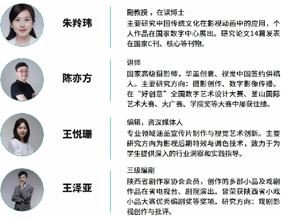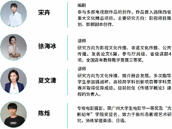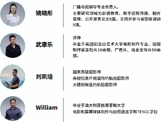 行业共享课+项目实践课:流媒体视音频制作(双语)、影视剧本创作、声音媒体艺术、中外电影史、综合实践创作(工作坊2)
